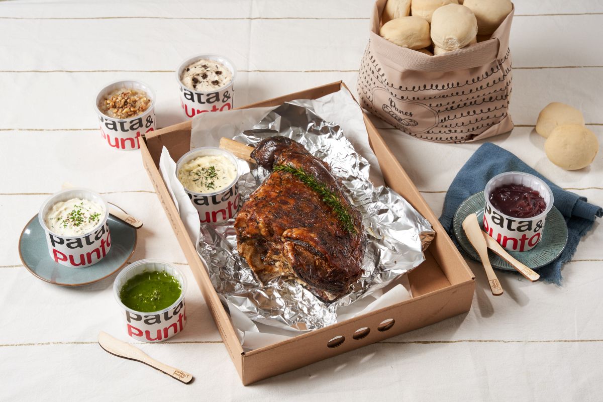 Pata de cordero horneado durante 4 hs para comer en Sandwich. Rinde 6 personas e incluye panes y Salsas.