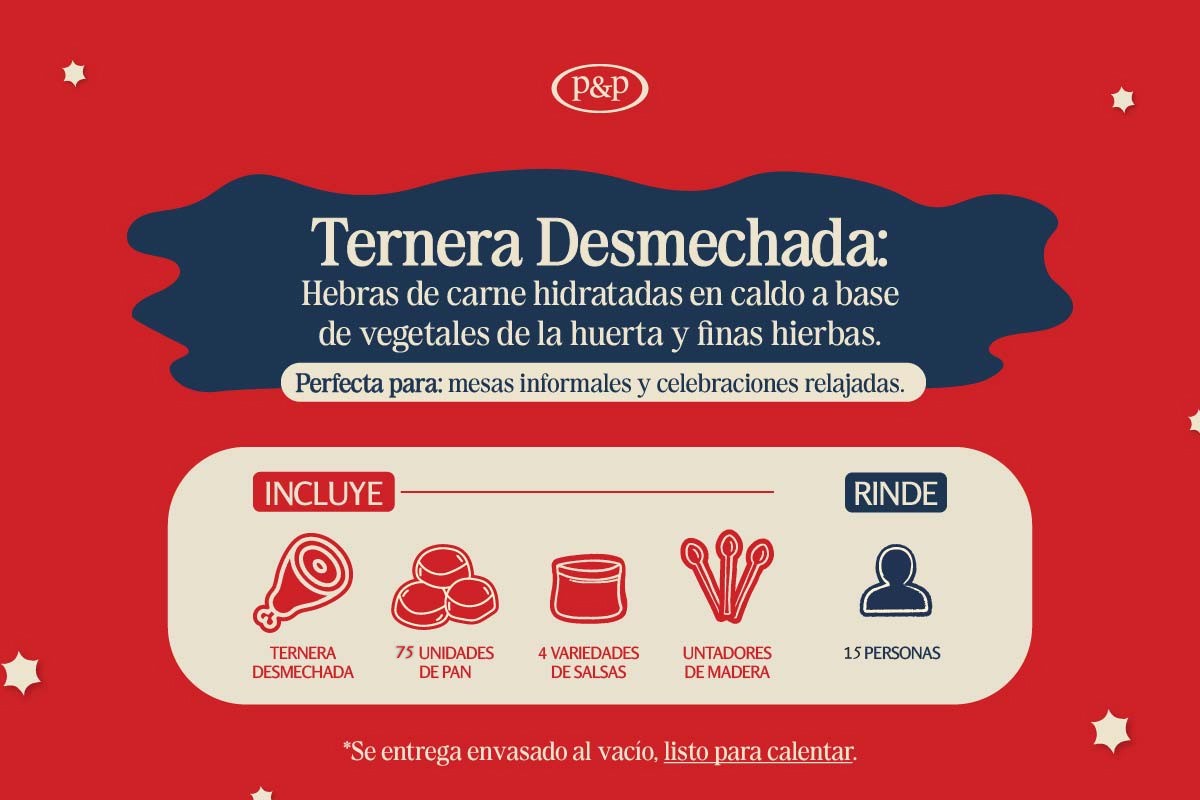 Hebras de carne hidratadas en caldo a base de vegetales de la huerta y finas hierbas. Rinde 15 personas e incluye Panes y Salsas.
