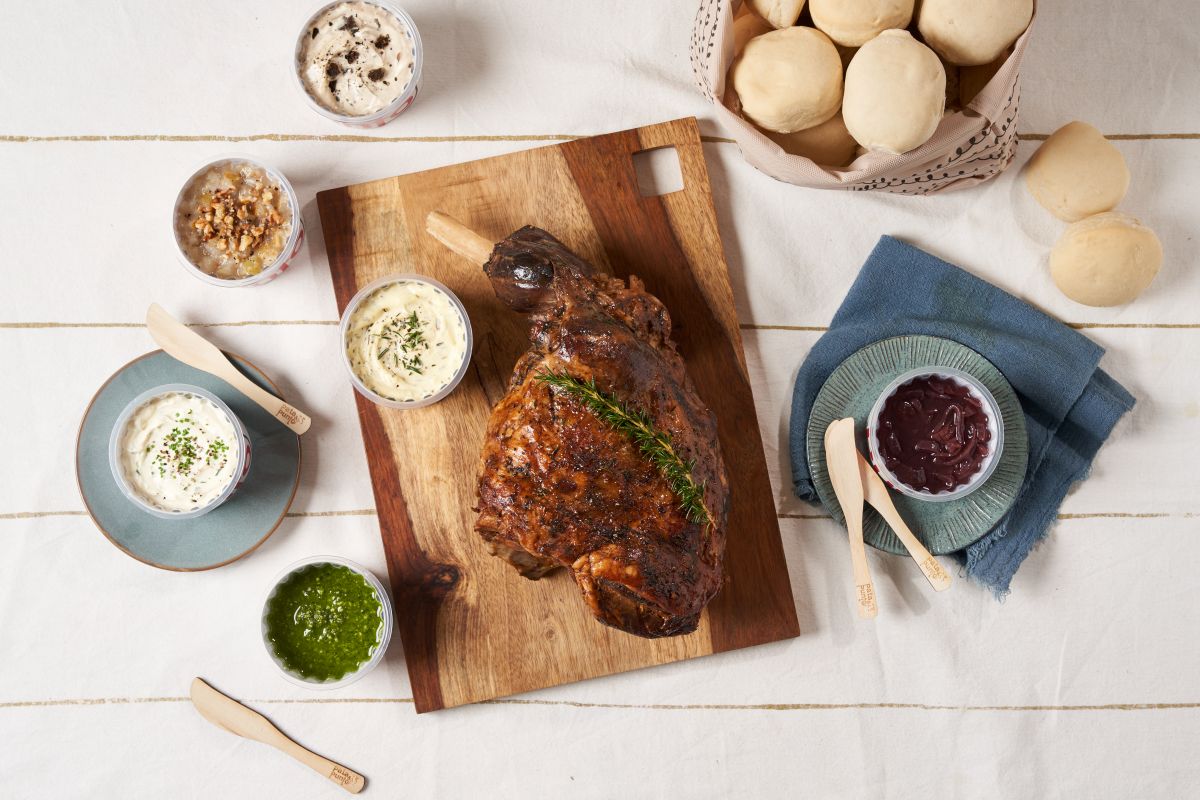 Pata de cordero horneado durante 4 hs para comer en Sandwich. Rinde 6 personas e incluye panes y Salsas.